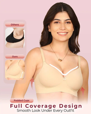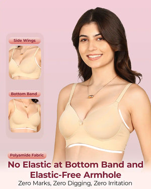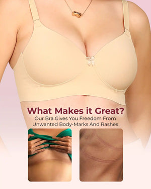 Meet your go-to bra for everyday confidence and comfort. Our Easy-Fit Padded Everyday Bra is crafted with stitch-free bonded technology for a smooth, invisible finish under fitted tops and tees. The lightly padded cups provide a natural lift and shaping while preventing show-through. Designed with an elastic-free bottom band and sidewings, it stays gentle on skin—no rashes, no red marks, no digging. Made from soft, breathable fabric, it feels like second skin while offering reliable all-day support. Perfect for work, casual outings, or lounging, this bra combines comfort, style, and invisibility in one everyday essential.