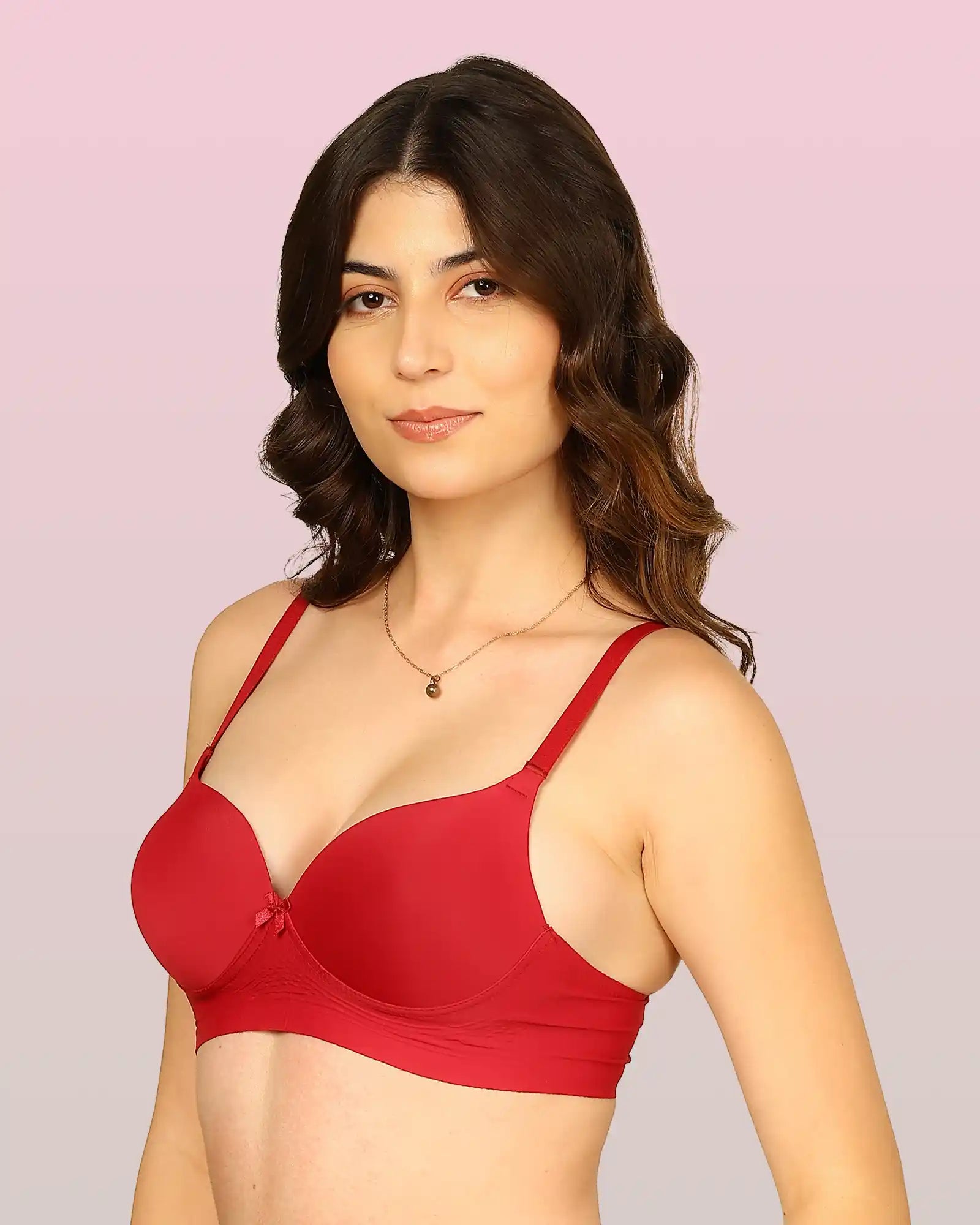 Enhance your natural shape with our Easy-Fit Maximiser Bra. Designed with advanced stitch-free easy-fit bonding technology, it offers a smooth, invisible look under any outfit. The heavily padded cups gives a boosted lift and add fullness, creating a rounder, more defined silhouette. With an elastic-free bottom band and sidewings, it ensures zero rashes, red marks, or irritation, keeping you comfortable all day. Breathable fabric, broad wings, and high coverage provide secure support while maintaining a flattering contour—making this bra the perfect blend of comfort, confidence, and style.