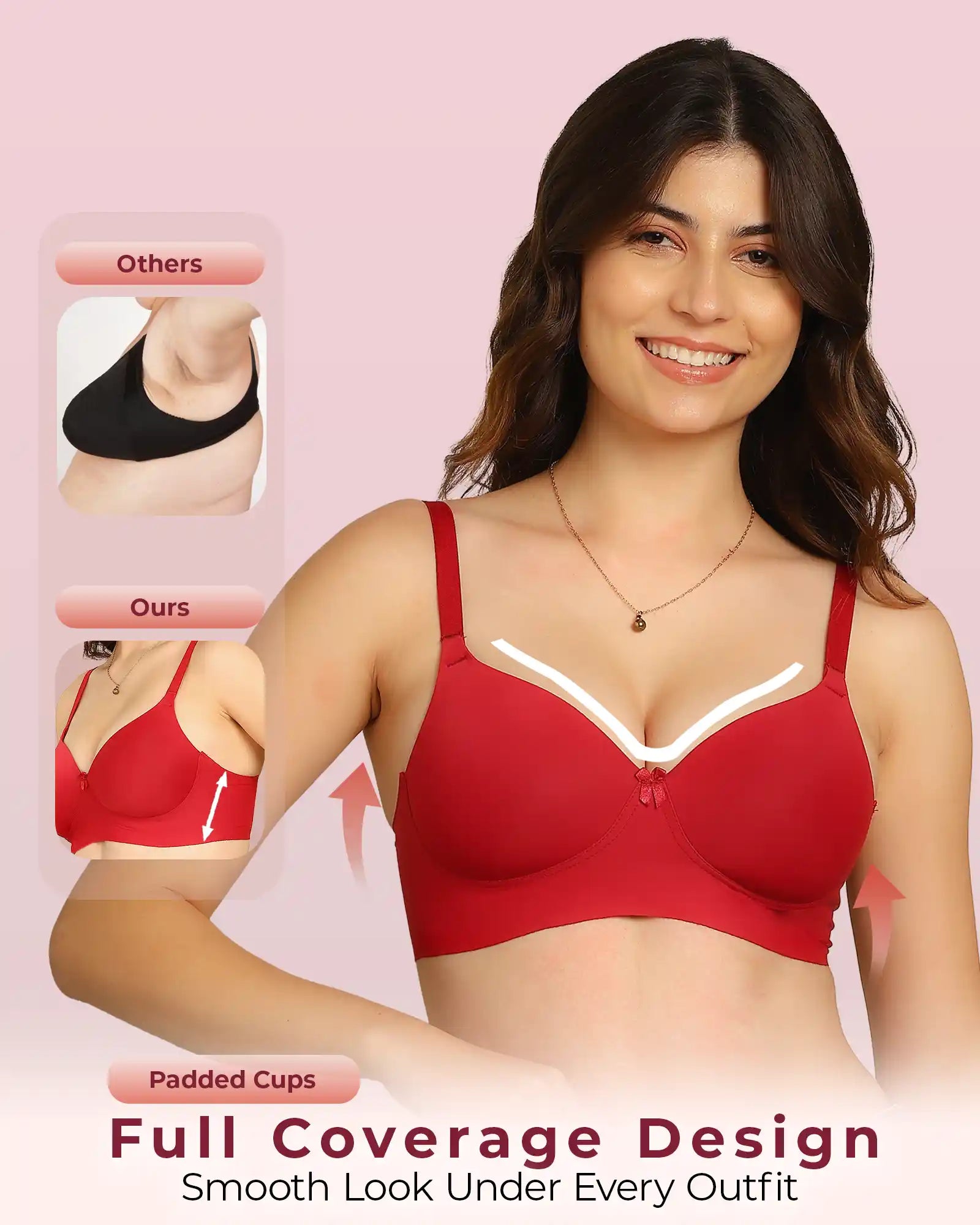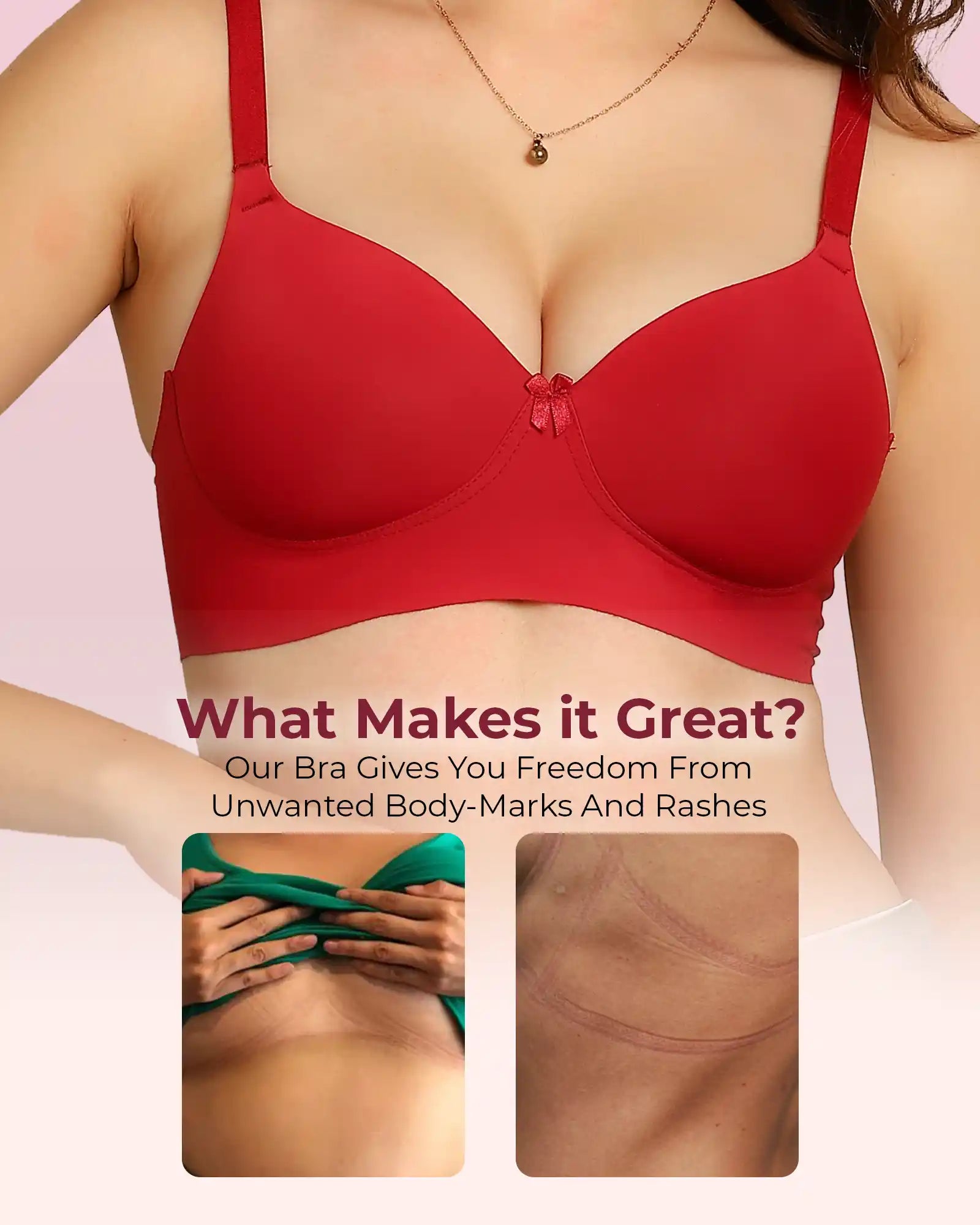 Meet your go-to bra for everyday confidence and comfort. Our Easy-Fit Padded Everyday Bra is crafted with stitch-free bonded technology for a smooth, invisible finish under fitted tops and tees. The lightly padded cups provide a natural lift and shaping while preventing show-through. Designed with an elastic-free bottom band and sidewings, it stays gentle on skin—no rashes, no red marks, no digging. Made from soft, breathable fabric, it feels like second skin while offering reliable all-day support. Perfect for work, casual outings, or lounging, this bra combines comfort, style, and invisibility in one everyday essential.